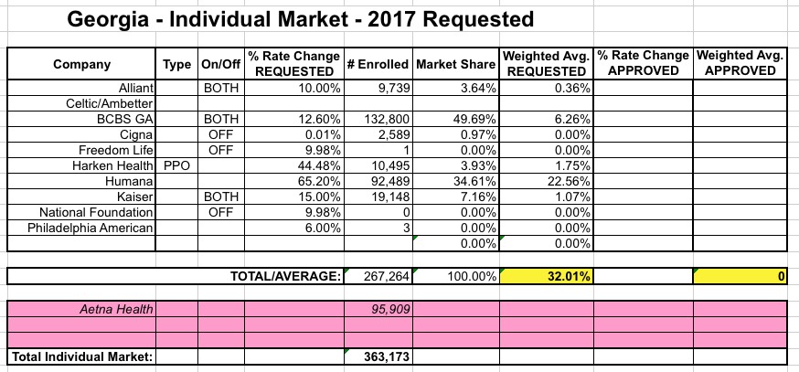 OK. Last week I wrote up a post speculating about the potential impact to the state- and national-level average rate hike requests of Aetna dropping out of the ACA exchanges in 11 states. My conclusion was that the average will increase in some states...but may actually drop in others, since Aetna would otherwise have asked for rate hikes higher than the average requested by the other carriers in that state. Of course, this isn't really a positive development, since their current enrollees are still losing their plans entirely, and since a 50% hike from Aetna could still end up costing less than a 10% hike from one of the other carriers...but as always, this is the best I can do here.