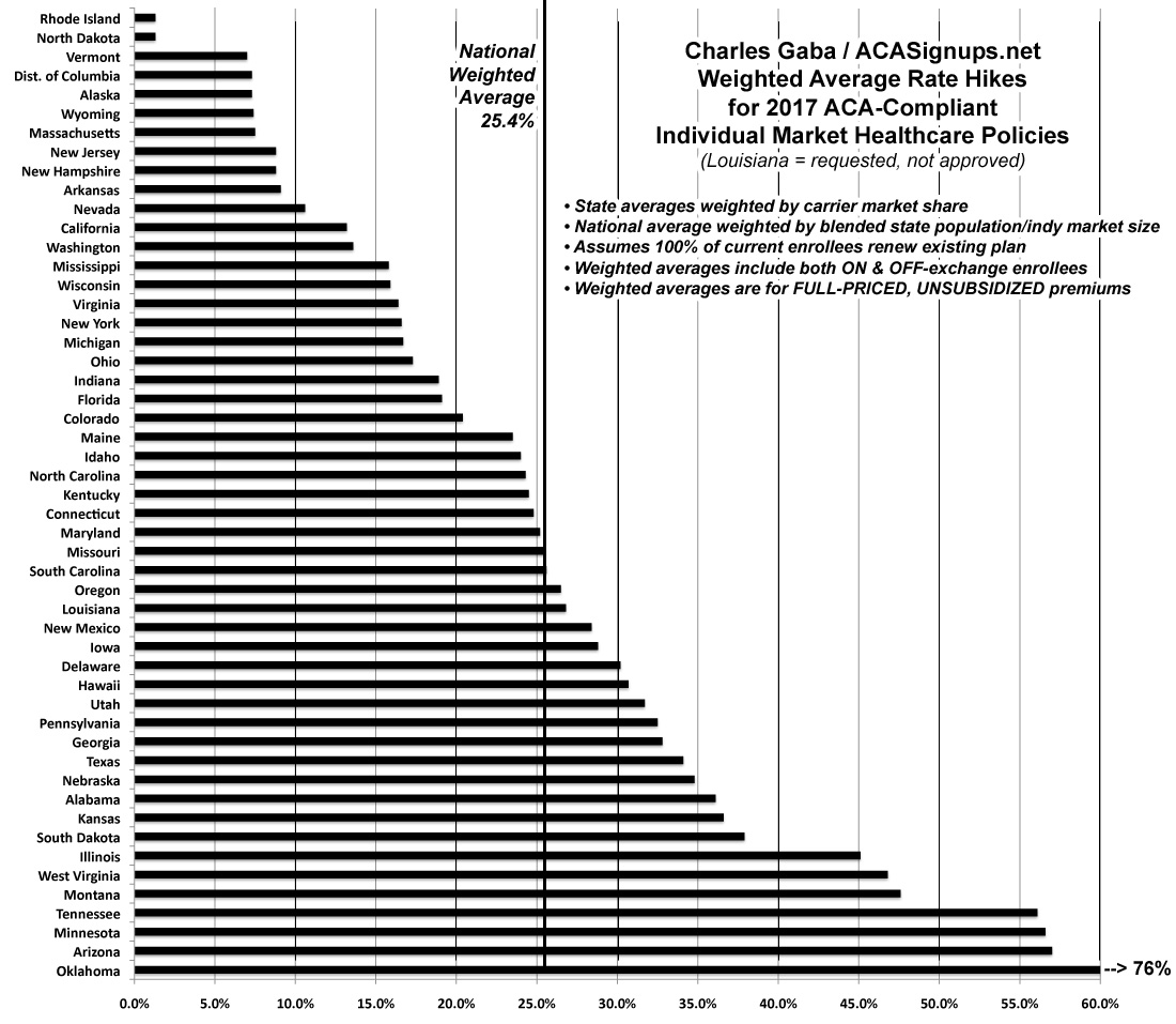 OK. I ran the numbers several different ways way back in August, when I had compiled the requested 2017 individual market rate hike averages for all 50 states (+DC). However, many things have changed since then. Not only do I have the approved rate changes for 48 states, there were a lot of other major changes along the way, including various carrier pullouts and rate filing re-submissions.