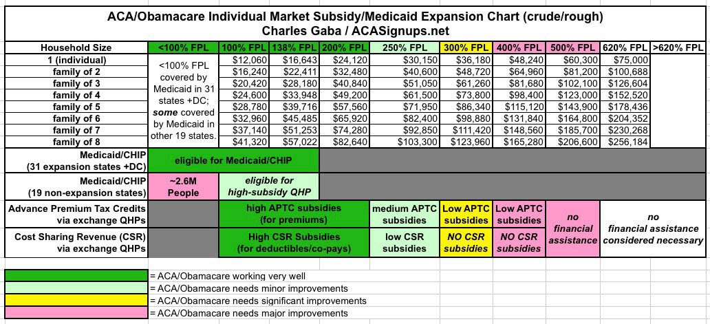 The trouble spot is obviously the 300-500% FPL range (500% FPL is roughly $60,000/year for an individual, or $123,000 for a family of 4).