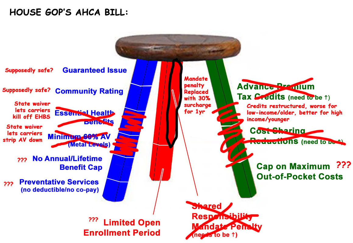 Instead, here...to the best of my reckoning...is what the House GOP's AHCA bill would do to the "3-legged stool" metaphor if implemented: Instead of lengthening the tax credits and penalty so that they balance out the carrier coverage regulations...the AHCA would: