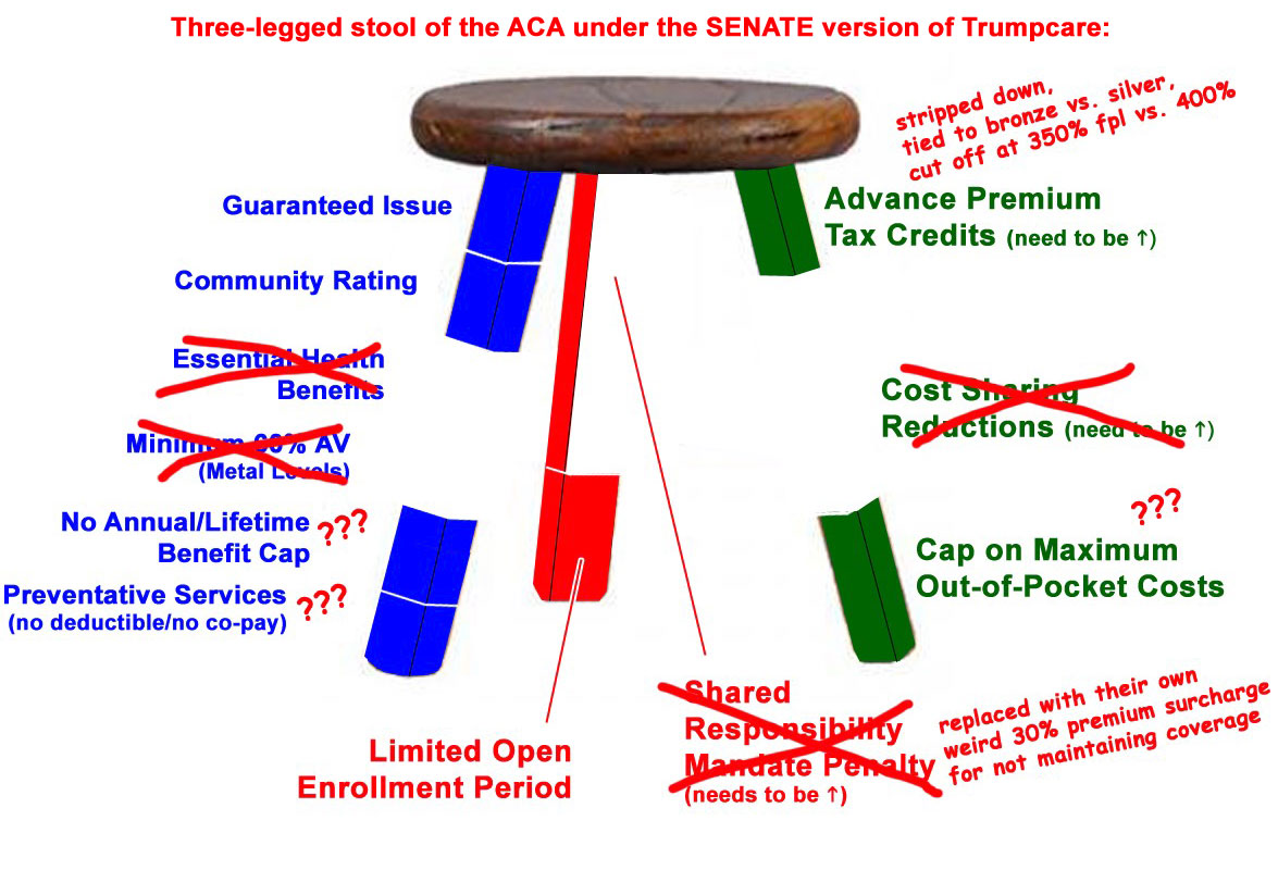 The GOP Senate version of Trumpcare attempts to balance the three-legged stool. The problem is that it tries to do this by shortening all three legs instead of lengthening the two which are too short. It basically tries to "solve" the problem by turning the Bar Stool into a Step Stool.
