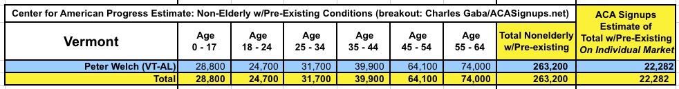 The CAP spreadsheet is extremely handy, and they deserve full credit for crunching the numbers. Unfortunately, it's only available as a single massive spreadsheet, so I've takent the liberty of grouping all 435 CDs together by state into shareable JPG images. I'm also color-coding each CD by party control and, while I'm at it, I'm also plugging in my own estimate of how many people currently on the individual market likely have some sort of pre-existing condition which would likely result in them being charged dramatically higher rates to the point that they likely couldn't afford coverage whatsoever if the Trumpcare 2.0 bill were passed. These estimates are obviously much lower than the total nonelderly population, and are based on: