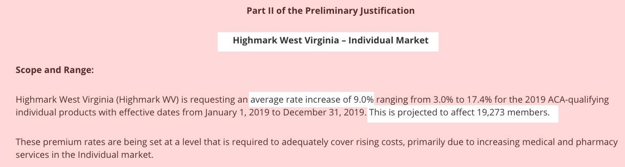 West Virginia's requested average rate increase was among the highest in the country for 2019--a weighted average of around 14.9%.