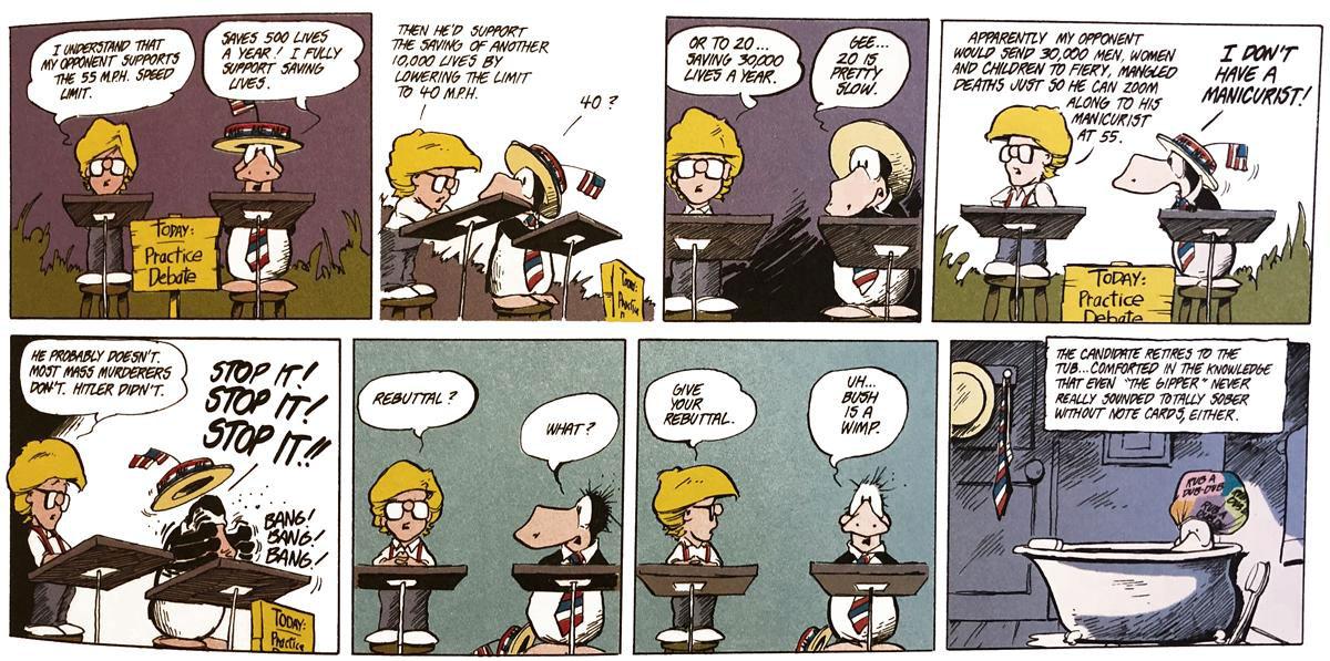 There's an old Bloom County which illustrates how a certain contingent of Bernie/M4A supporters have been approaching the debate until now (click for higher-res version):