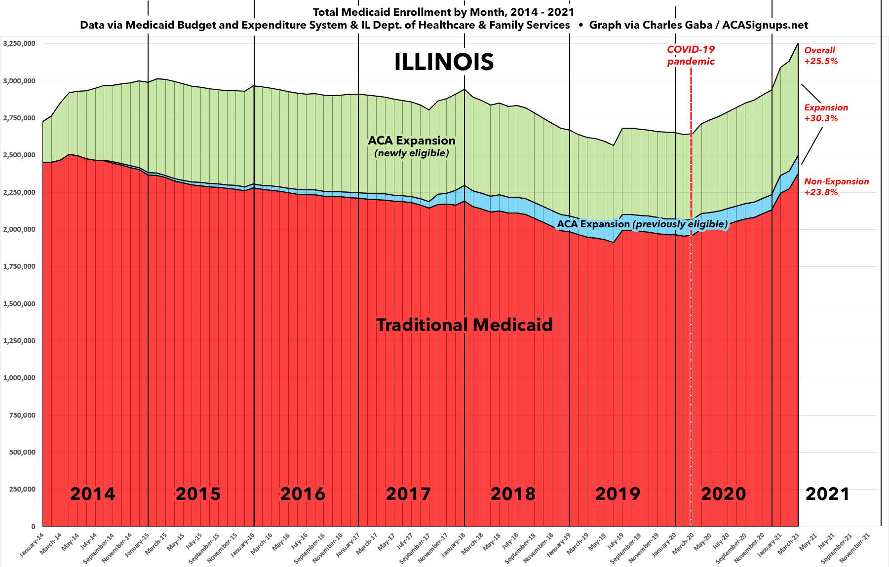 Today I'm presenting Illinois. For enrollment data from January 2021 on, I'm relying on adjusted estimates based on raw data from the Illinois Dept. of Healthcare & Family Services.