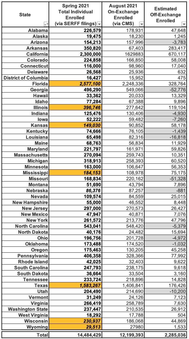 I've highlighted the states which rely on Mark Farrah estimates in orange. As you can see, this cuts the total ACA-compliant market estimate down from 15.9 million to 14.5 million, and the off-exchange estimate from 3.7 million to 2.3 million, which seems a lot more likely given the ~2.1 million estimate by Kaiser two years ago.