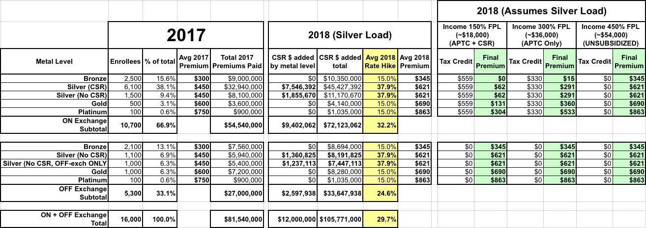 According to my data, on average nationally, unsubsidized 2018 individual market rates would have gone up around 15% assuming every carrier in every state assumed CSR payments would be made for 2018. That amounts to roughly $12.2 million in additional expenses total for all 16,000 enrollees as a whole (that is, around $93.8 million total in 2018 vs. $81.5 million in 2017).