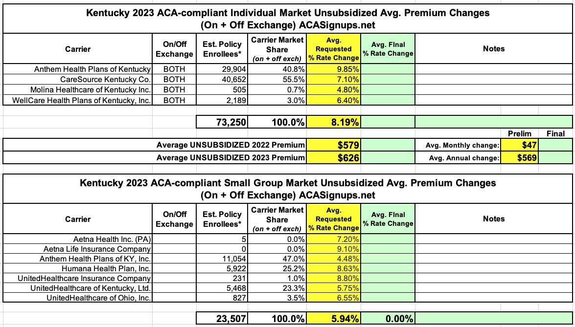 Kentucky: (Preliminary) avg. unsubsidized 2023 #ACA rate changes: +8.2%