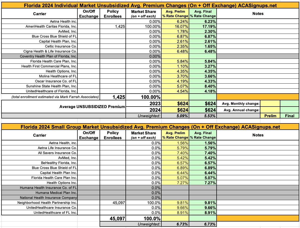 Florida: *Final* avg. unsubsidized 2024 #ACA rate changes: +5.5% (unweighted) (updated)