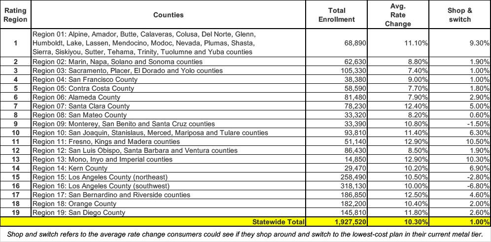 While final rates are often significantly different from preliminary ones in some states, it's my understanding that California regulators usually work pretty closely with the state exchange and the carriers throughout the process, so my guess is that the 10.3% overall rate hike isn't likely to change by much in the end.