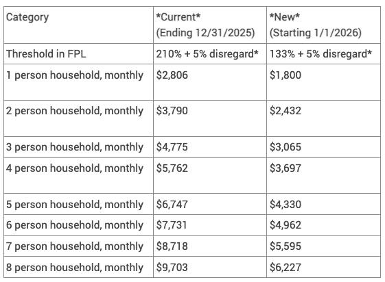 • Income limits for parent and caretaker relatives will decrease from 215% to 133% of federal poverty level) FPL starting 1/1/2026 (see current and new income standards in chart below).