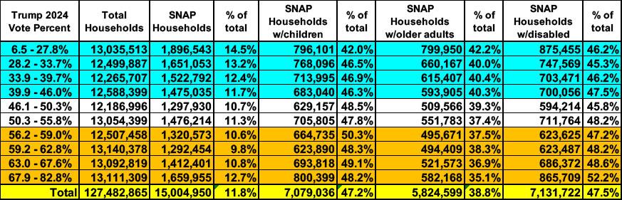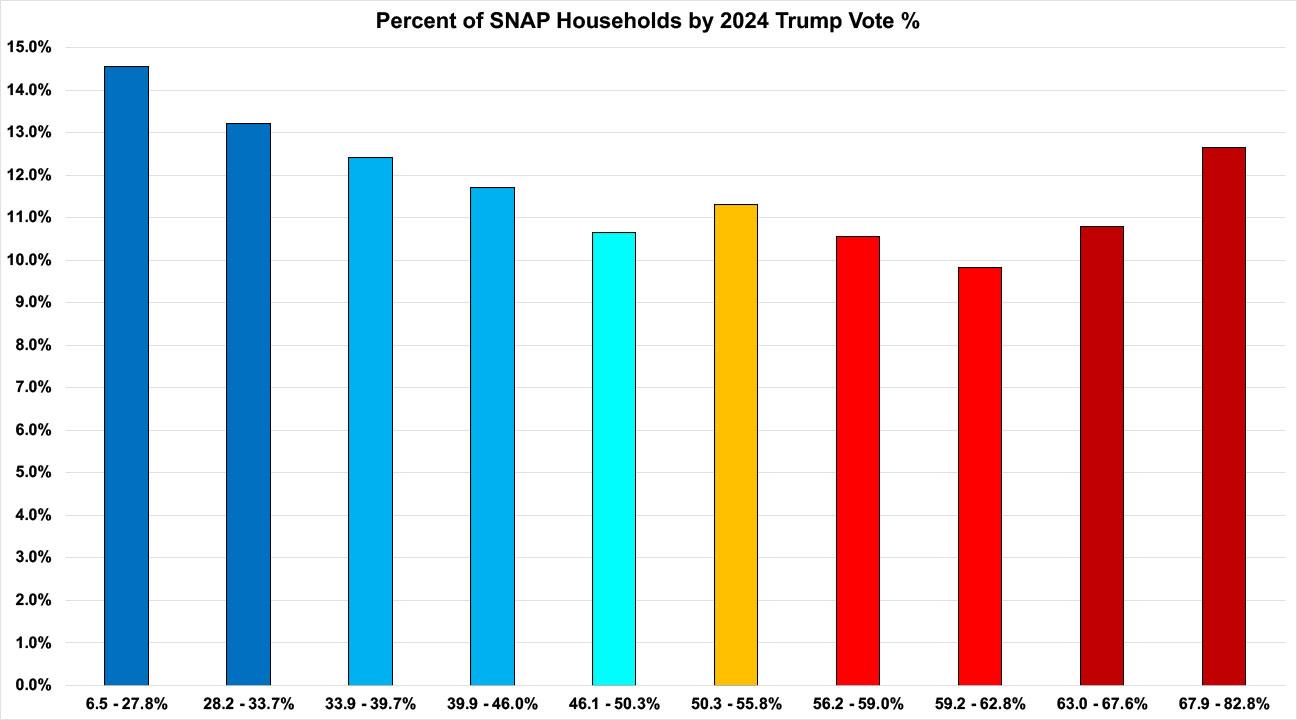 Today, with Supplemental Nutrition Assistance Program (SNAP) benefits also about to be cut off to over 40 million Americans by Congressional Republicans, I decided to take a similar look at how that breaks out along partisan lines.