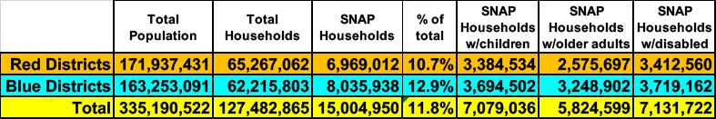 Next, note that the average number of people per household is virtually identical between the two: 2.63 in red districts vs. 2.62 in blue ones, so that checks out (also, 2.63 x 15.0 million = ~39.5 million which is pretty close to the actual 41.7 million SNAP recipients nationally according to CBPP.