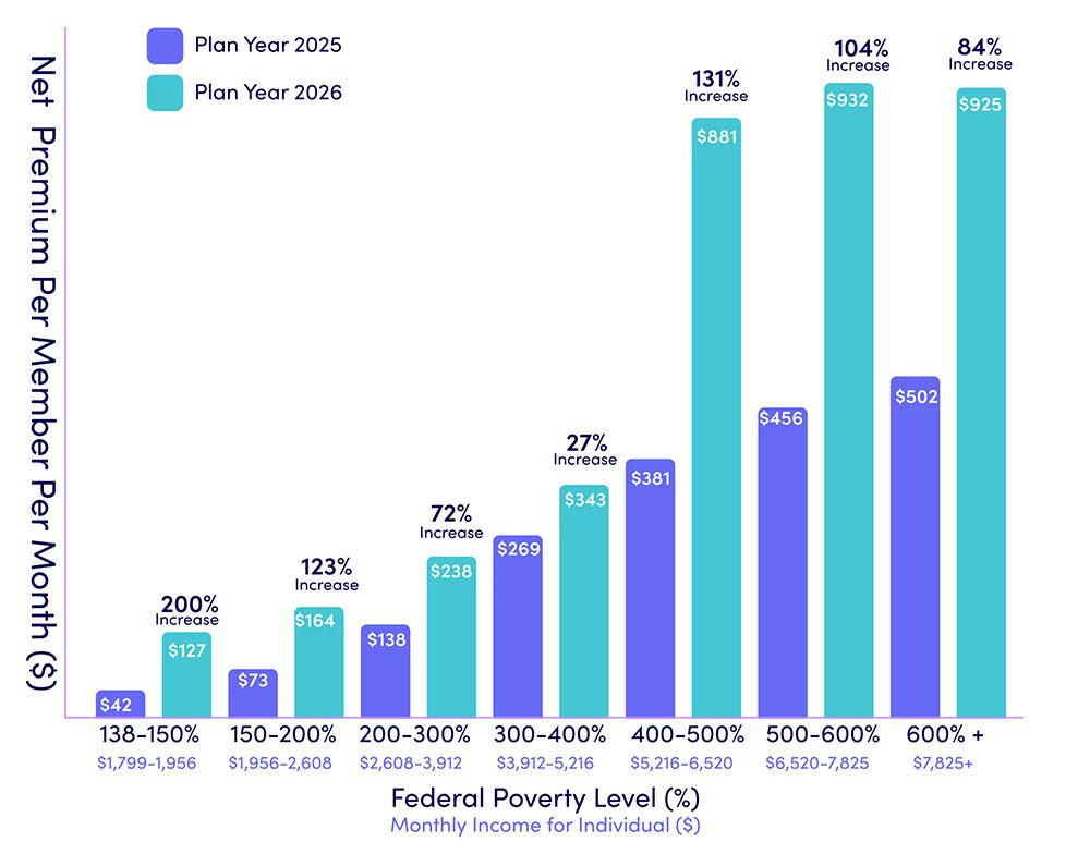 One of the graphs they provide breaks out average real world net premium hikes for 2026 enrollees at different income levels.