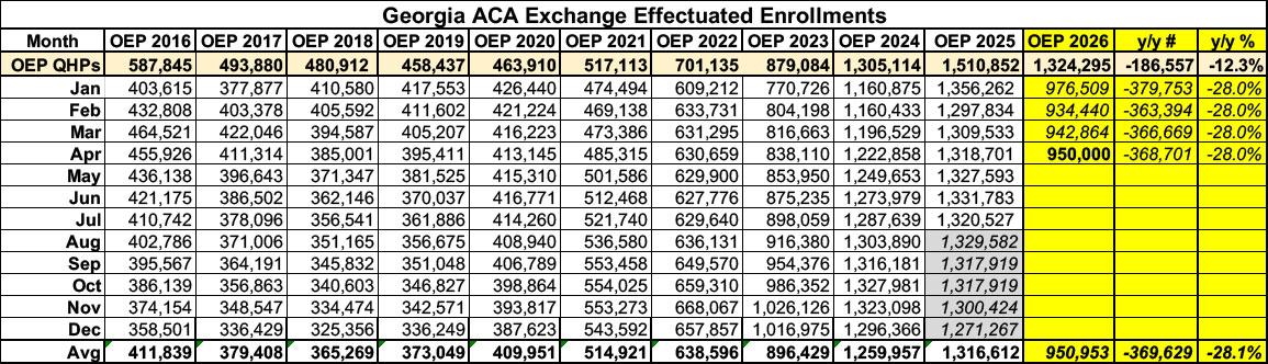 Effectuated enrollment as of April is "only" around 370,000 lower than it was in April 2025, or down roughly 28% instead of the 37% stated in the Current GA article, which compares April's effectuated number against the total number of OEP plan selections.