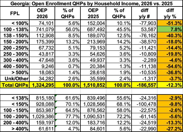 You can also see this when you break year over year enrollment out by income bracket: In the other four states, enrollment actually increased in several different brackets thanks to those states implementing mitigation programs, but in Georgia, the only one which saw any increase at all is the 100 - 138% bracket, and I'm guessing most of that is due to enrollees who normally earn slightly less than 100% FPL projecting an actual 2026 household income of just over the 100% threshold (and who are now desperately scrambling to make sure that happens):
