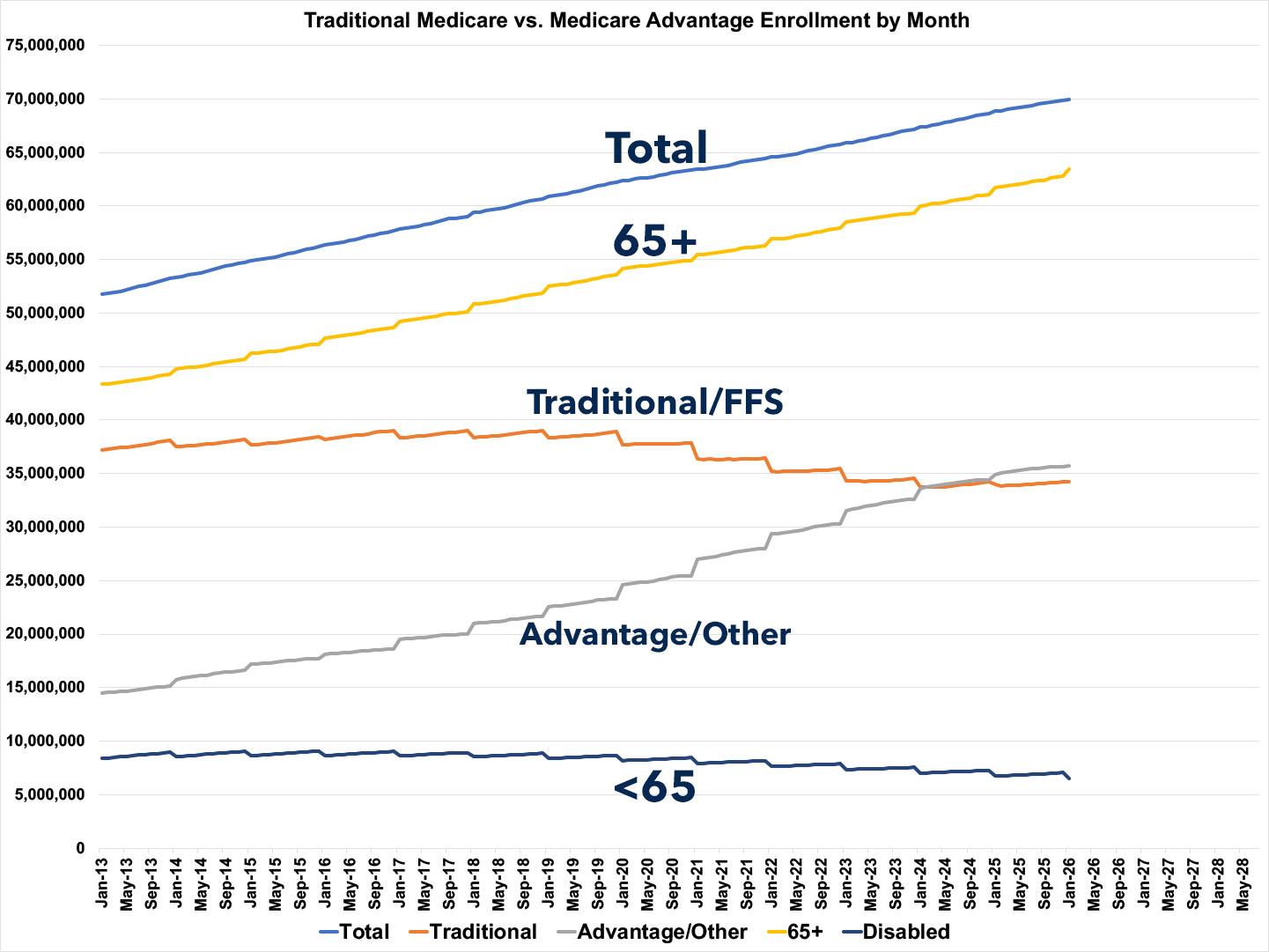 • Total Medicare beneficiaries are up to 69.98 million (up ~37K month over month)
