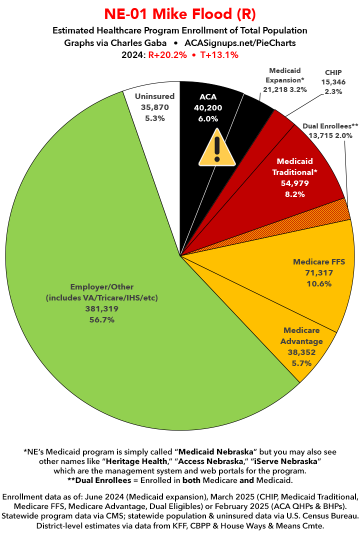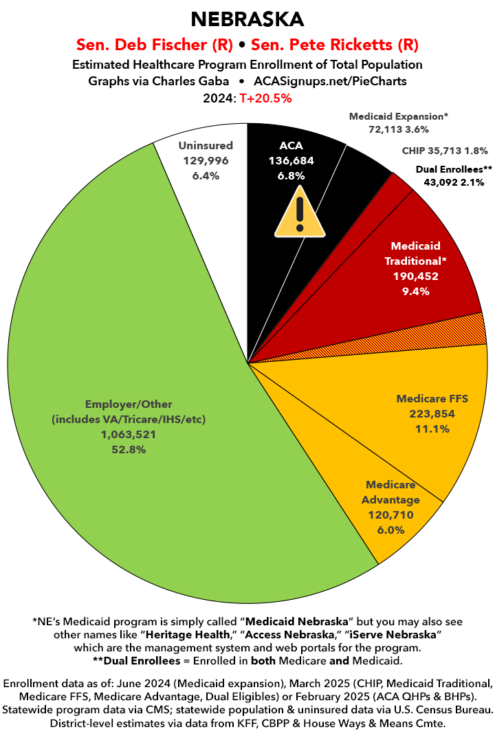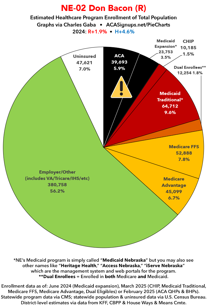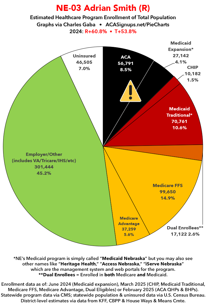 UPDATE 7/6/25: I've updated the web versions of the graphics with the most up-to-date enrollment data I have access to. The black sections w/the ⚠️ symbol are those most at risk of losing healthcare coverage due to H.R. 1, the "One Big Beautiful Bill Act" (aka the #MAGAMurderBill).
