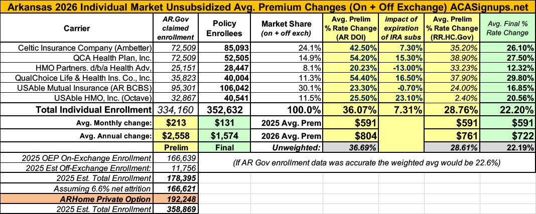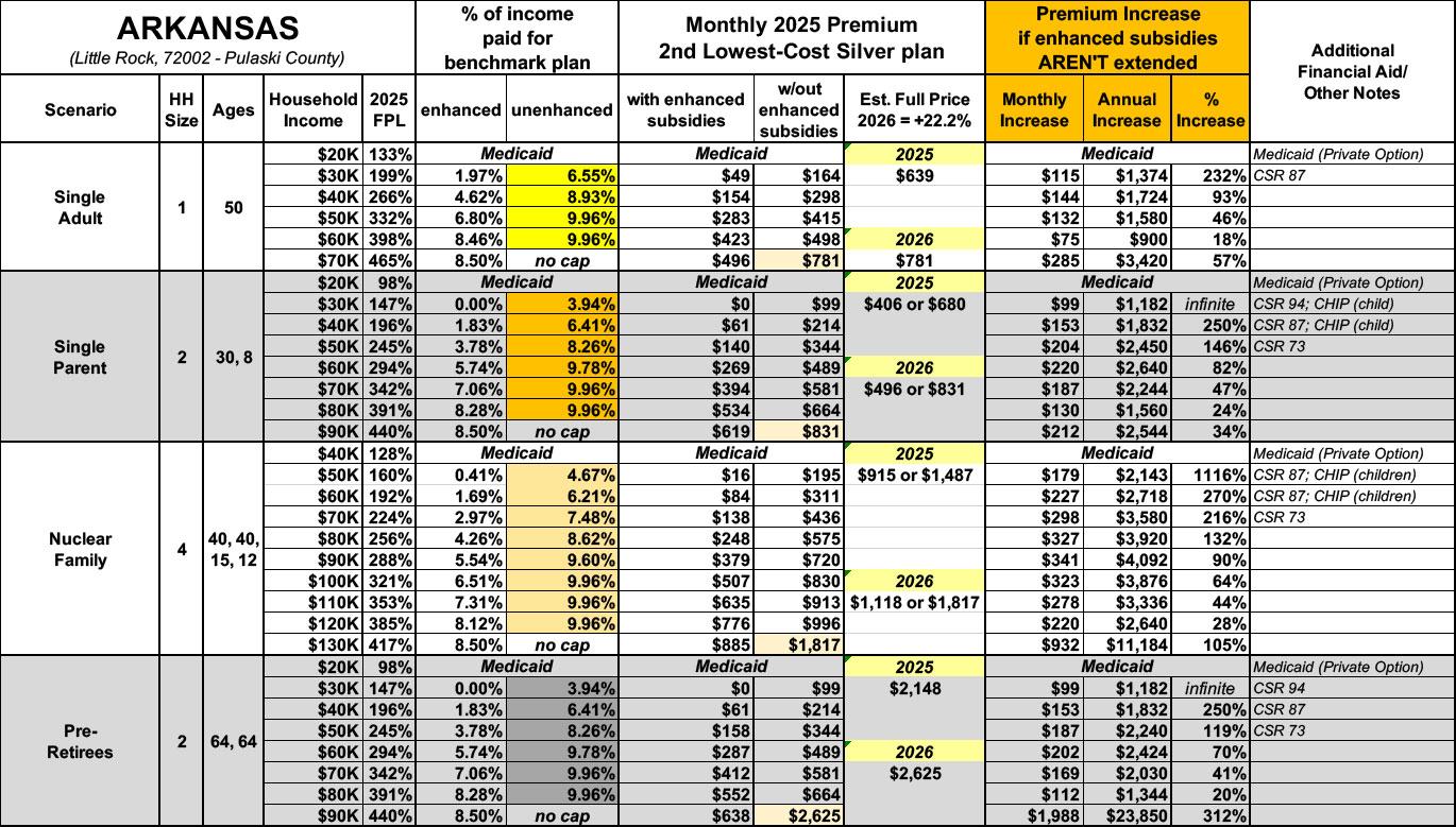 The original version of this analysis included a 4.3% increase in the unsubsidized benchmark plan premium based on a projection by the Congressional Budget Office. However, that was a national average projection which didn’t take into account other factors like increased utilization, medical inflation and so on. This updated version assumes the actual 2026 Arkansas rate filings which average 35.7% statewide.