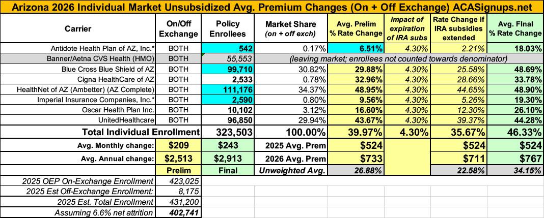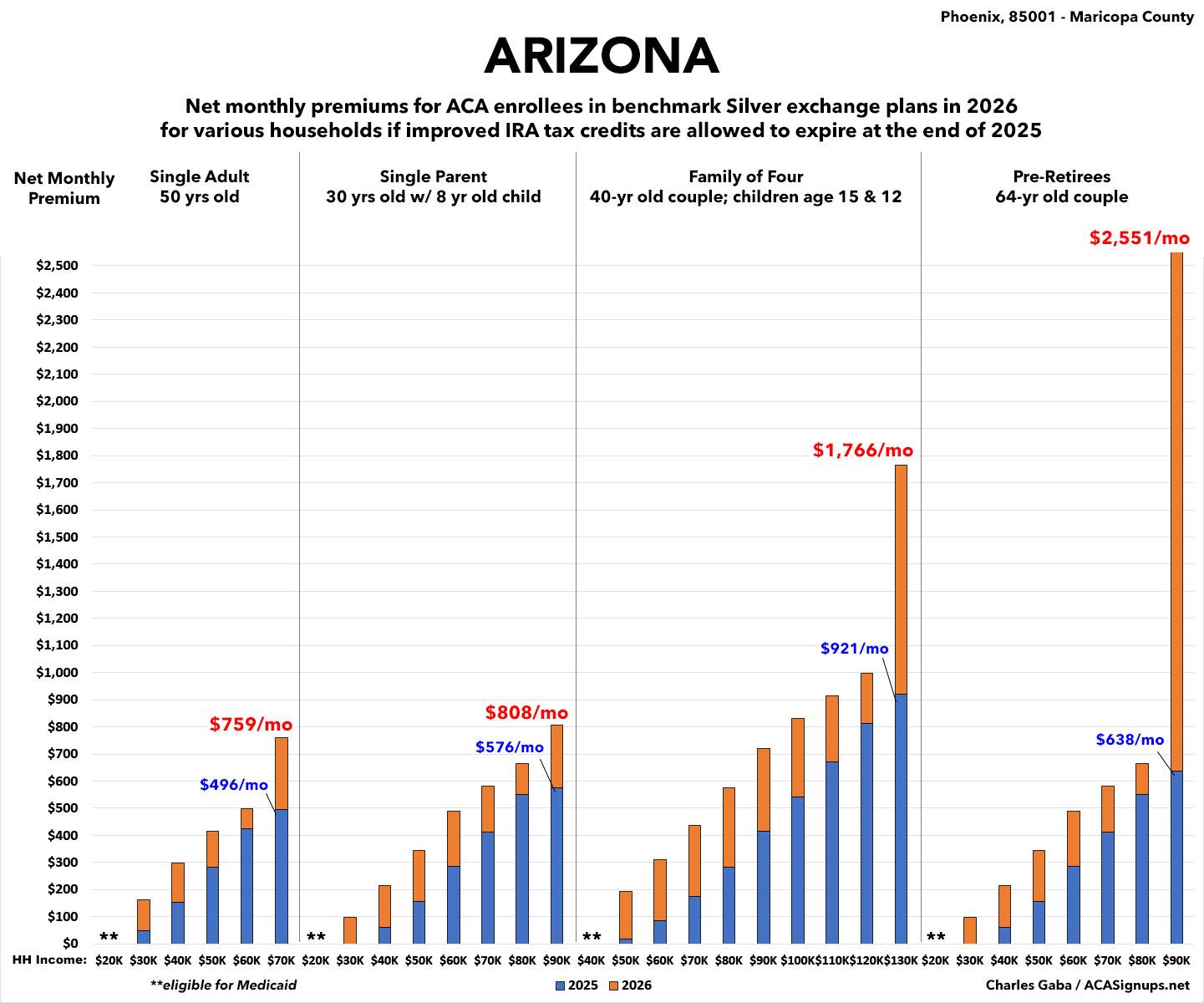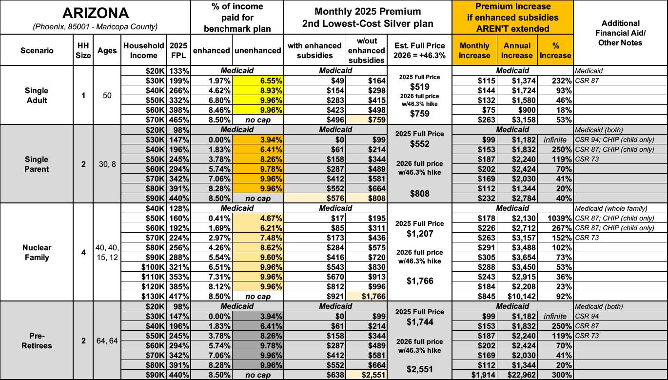 Arizona has around 423,000 residents enrolled in ACA exchange plans, 88% of whom are currently subsidized. I estimate they also have perhaps another ~8,000 unsubsidized off-exchange enrollees.