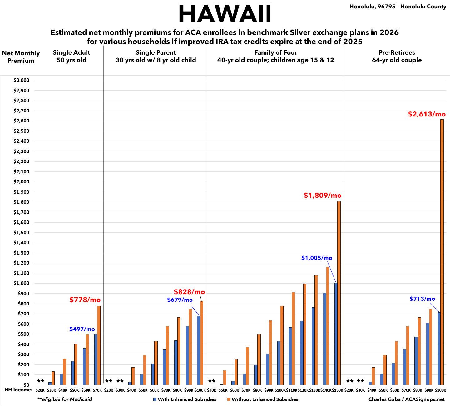 NEW: The original version of this analysis included a 4.3% increase in the unsubsidized benchmark plan premium based on a projection by the Congressional Budget Office. However, that was a national average projection which didn’t take into account other factors like increased utilization, medical inflation and so on. This updated version assumes the actual 2026 Hawaii rate filings which average 12.6% statewide.