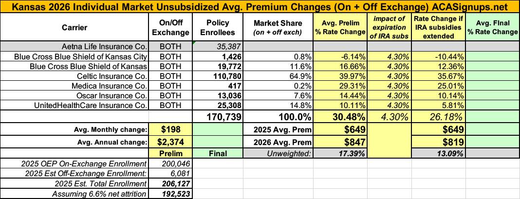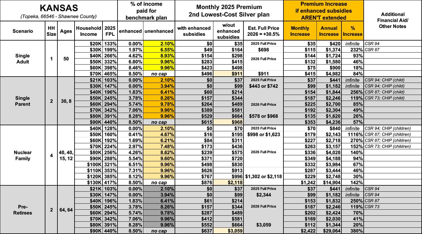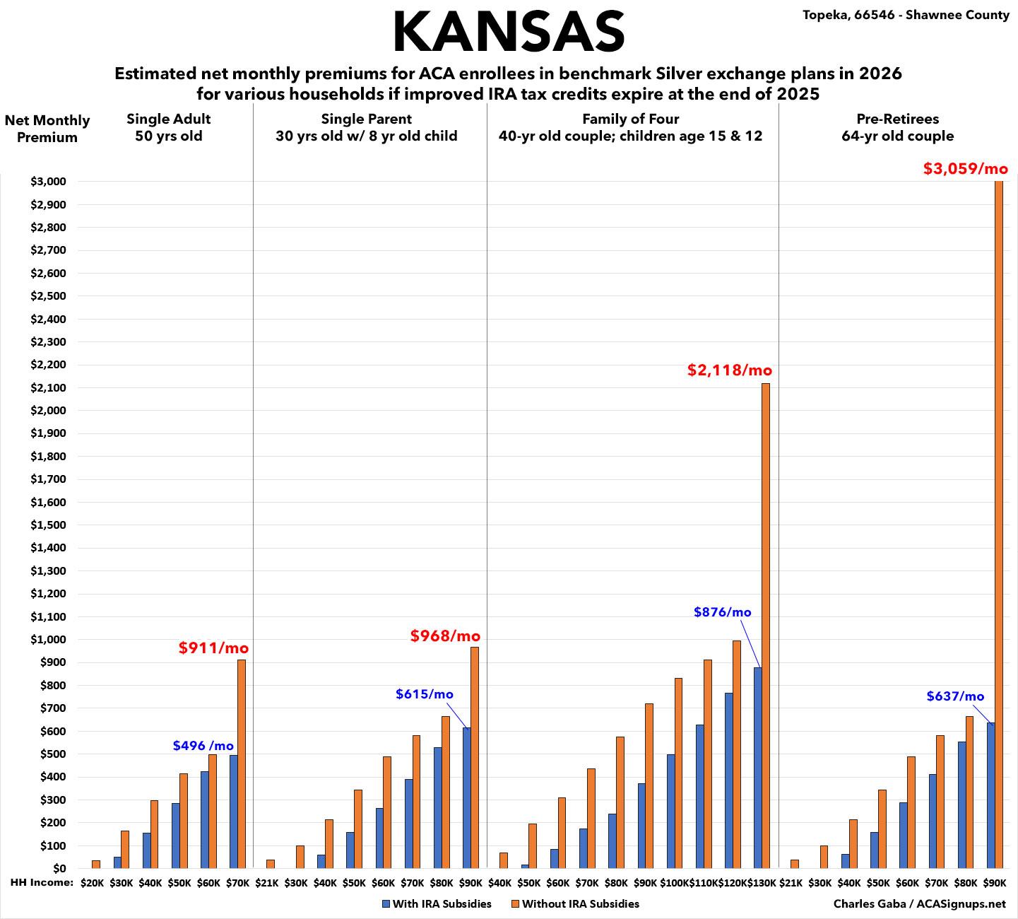 Kansas has around 200,000 residents enrolled in ACA exchange plans, 94% of whom are currently subsidized. I estimate they also have another ~6,000 unsubsidized off-exchange enrollees.