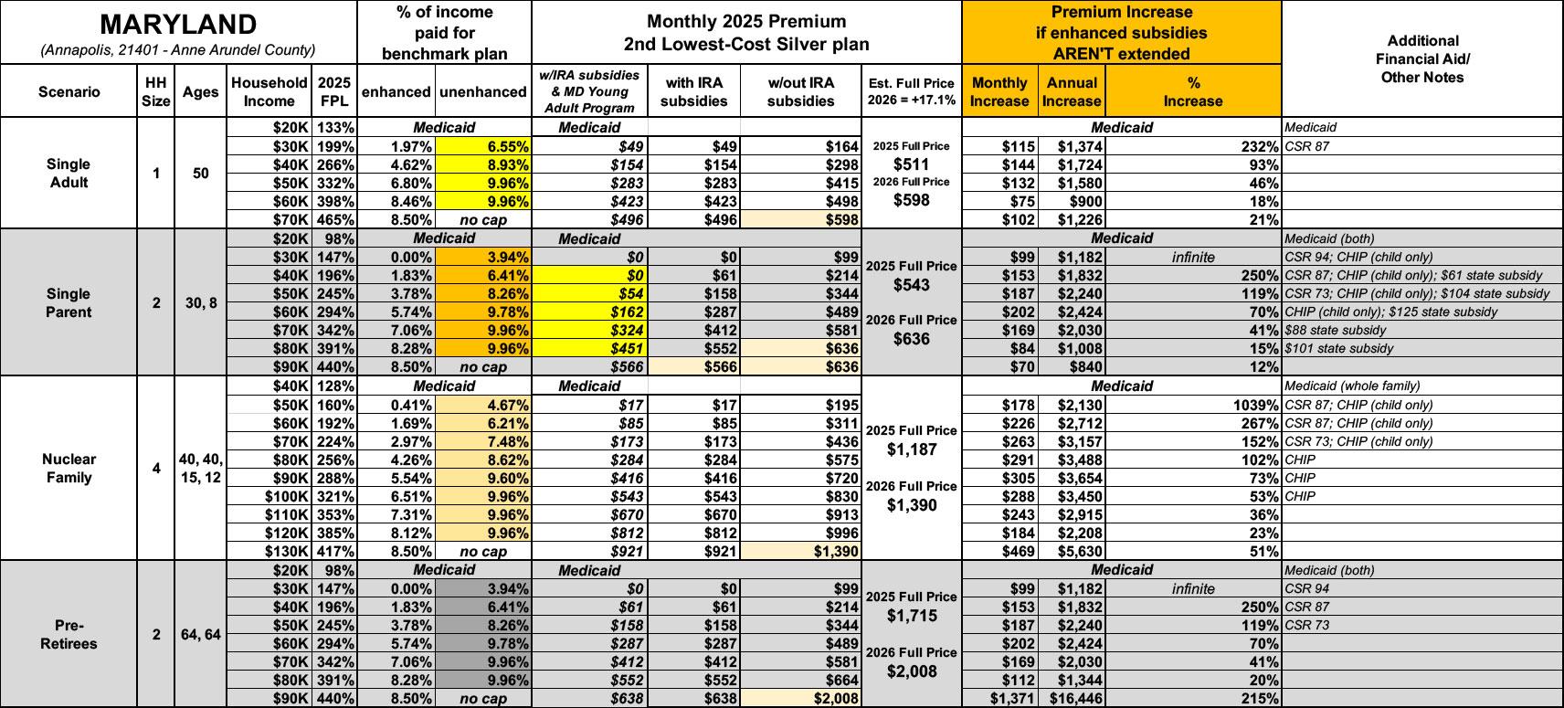 Maryland has around 247,000 residents enrolled in ACA exchange plans, 76% of whom are currently subsidized. I estimate they also have another ~73,000 unsubsidized off-exchange enrollees.