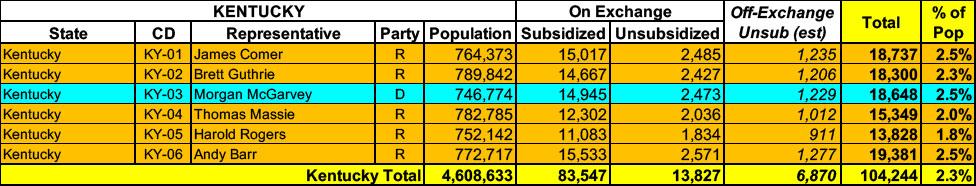 Kentucky has around 97,000 residents enrolled in ACA exchange plans, 86% of whom are currently subsidized. I estimate they also have another ~6,800 unsubsidized off-exchange enrollees.