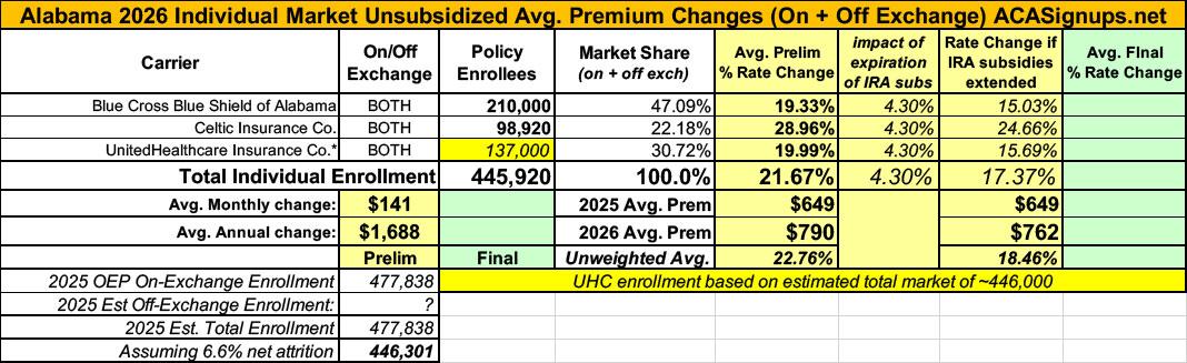 - BCBSAL is projecting that a significant number of Individual members will leave the Alabama Individual ACA market in 2026 as enhanced premium subsidies become unavailable and members are no longer able to afford their out-of-pocket premiums.