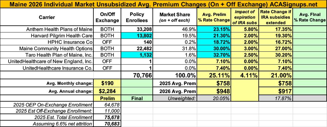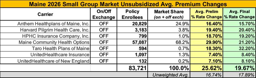 UPDATE 9/4/25: The Maine Insurance Dept. has published the final, approved 2026 rate changes for both the individual and small group markets.