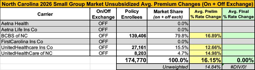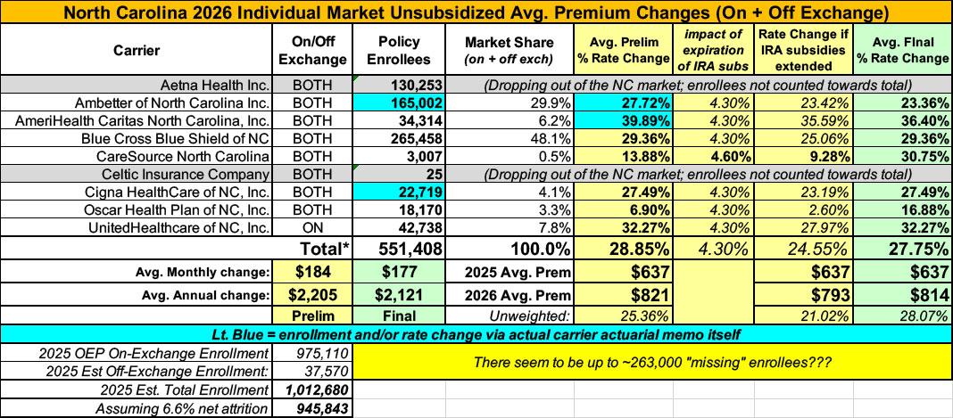 2026 FINAL Gross Rate Changes - North Carolina: +27.8%; what happened to ~263,000 "missing" enrollees?? (updated)