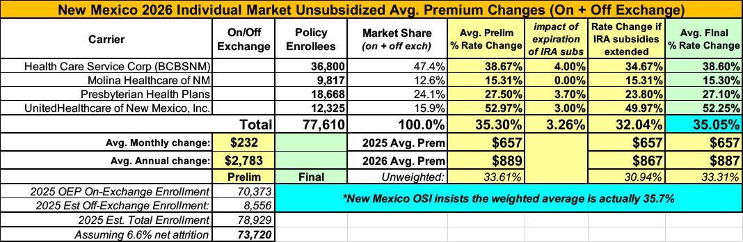 UPDATE 8/29/25: The New Mexico Office of Superintendent of Insurance (OSI) has issued a press release stating that they've approved the rate filings for all 4 individual market carriers with a weighted average increase of 35.7% (slightly higher than the preliminary 35.3%). From what I can tell the actual weighted average of the approved filings is slightly lower at 35.1%, but I'll have to go with NM OSI as the final word: