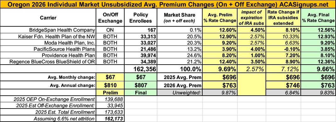 State regulators appear to have made virtually no changes to any of them, so the final avg. rate increase for unsubsidized Oregon enrollees will be around 9.7%.