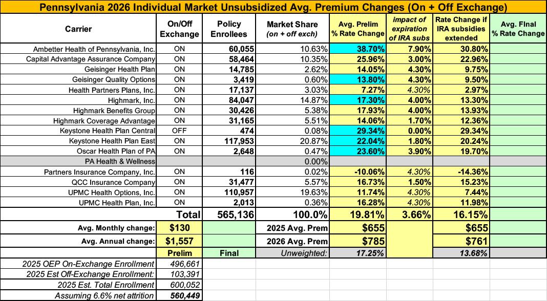 For carriers which don't publicly clarify how much the IRA subsidies expiring are impacting unsubsidized rate changes I'm substituting the CBO's projection of 4.3% for 2026 from last December.