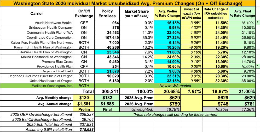2026 Final Gross Rate Changes - Washington: +21% avg; ~305,000 enrollees are in for a hell of a shock this fall (updated)